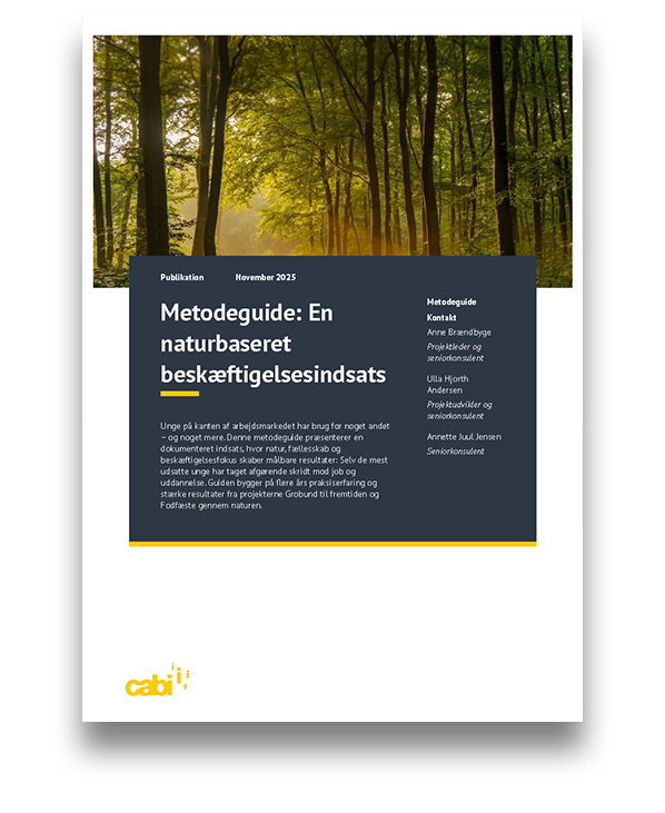 Guiden giver konkrete greb og anbefalinger til, hvordan natur, fællesskab, relationer og virksomhedsrettede elementer kan tænkes sammen i én indsats. Den kan bruges som inspiration, hvis I vil styrke jeres eget arbejde med unge på kanten af job og uddannelse.